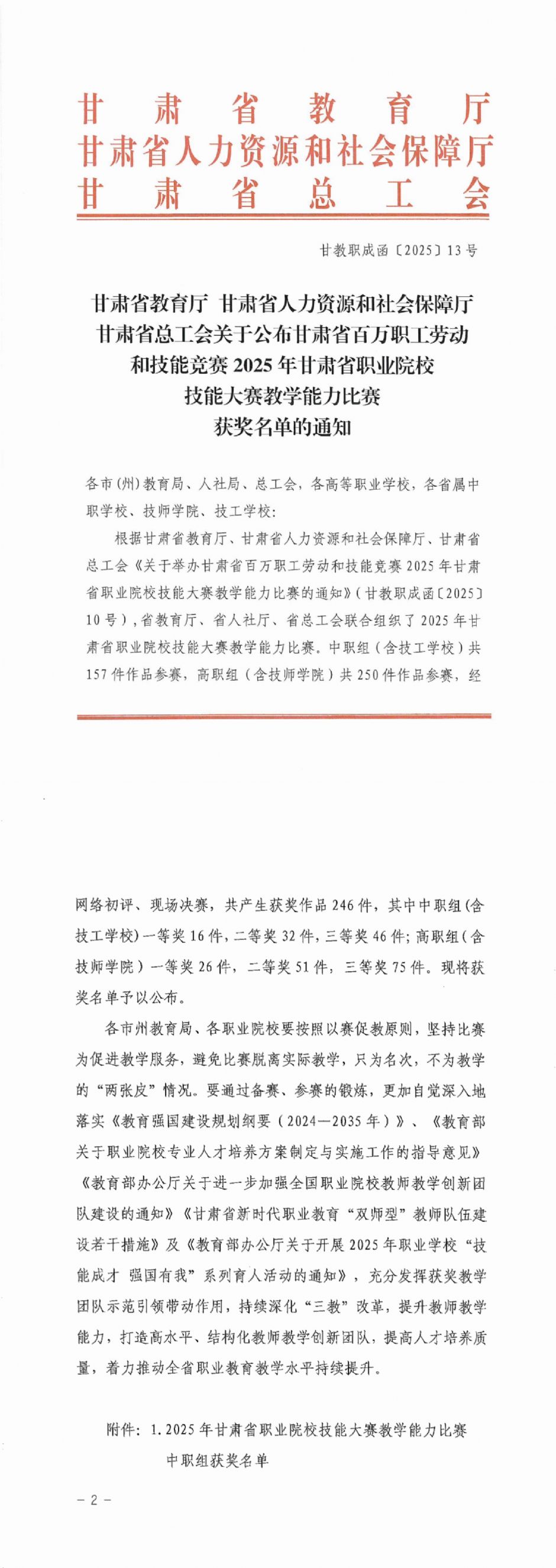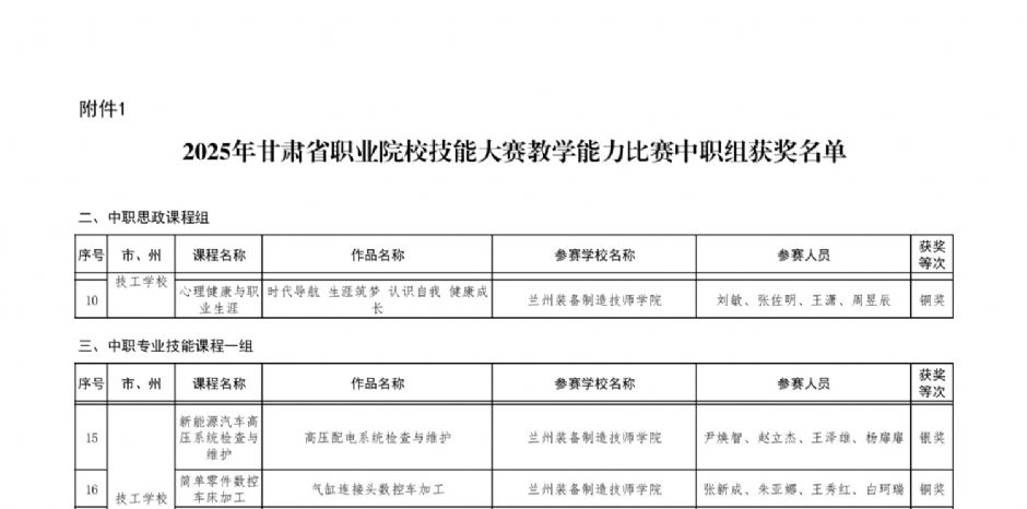 在由甘肃省教育厅、甘肃省人力资源和社会保障厅、甘肃省总工会联合举办的2025年甘肃省职业院校技能大赛教学能力比赛中,学院教师团队凭借扎实的教学基本功与创新的教学设计,在大赛中喜获佳绩。