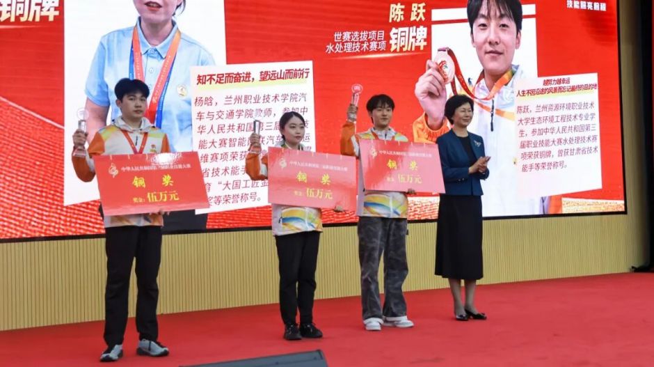 大会通报了甘肃代表团参加中华人民共和国第三届职业技能大赛获奖情况,颁发了优胜奖奖金、“优秀教练团队”奖牌及证书、铜牌奖金和“陇原技能大奖”奖杯。