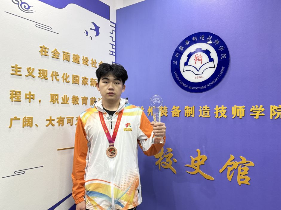 学院冷作钣金工专业学生彭传伟作为第三届全国职业技能大赛建筑金属构造项目铜牌、最佳选手获得者上台领奖。
