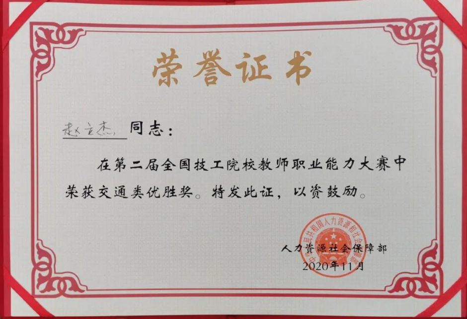 11月19日-21日,第二届全国技工院校教师职业能力大赛总决赛在浙江省杭州市举行。经过激烈角逐,学院赵立杰老师荣获交通类优胜奖。